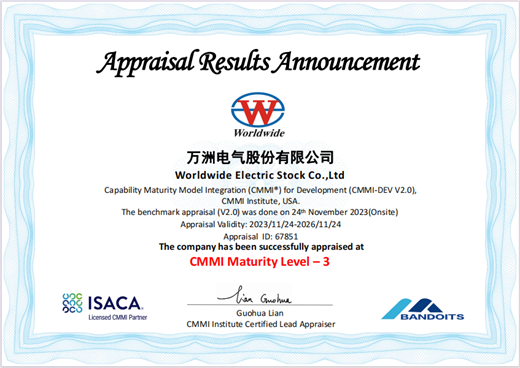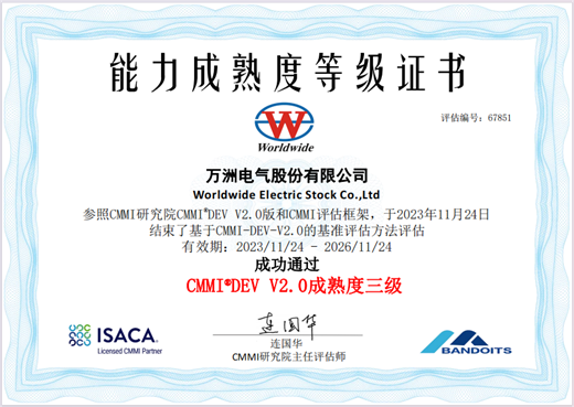 近日,萬洲電氣取得CMMI研究院頒發(fā)的CMMI3級認證證書,標志著萬洲電氣的軟件研發(fā)能力成熟度已達到國際水準。